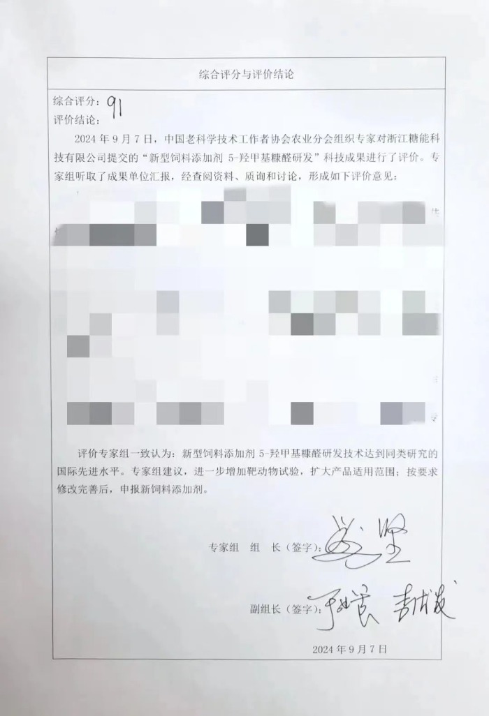 W dniu 7 września 2024 r. osiągnięcia naukowo-technologiczne „Badania i rozwój 5-hydroksymetylofurfuralu, nowego dodatku paszowego” zgłoszone przez Zhejiang Sugar Energy Technology Co., Ltd. przeszły ocenę ekspercką zorganizowaną przez Oddział Rolniczy Chińskiego Stowarzyszenia starszych naukowców i techników.